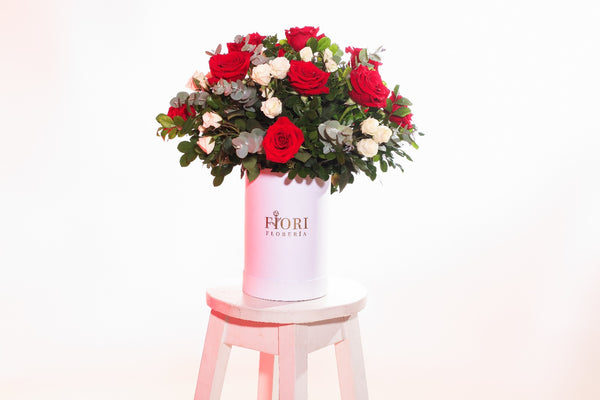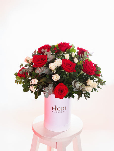BOX TESORO CON 12 ROSAS ROJAS Y 8 MINI ROSAS BLANCAS