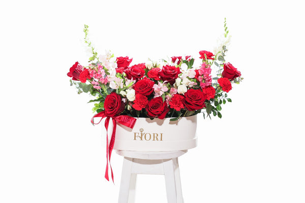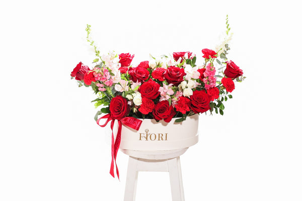 BOX GARDEN CON 10 ROSAS ROJAS, ROSAS SPRAY, ASTROMELIAS, CONEJITOS Y CLAVELES