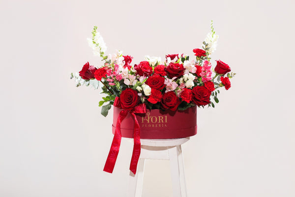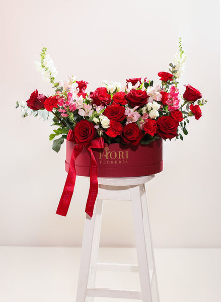 BOX GARDEN TONO BORDO CON 10 ROSAS ROJAS, ROSAS SPRAY, ASTROMELIAS, CONEJITOS Y CLAVELES